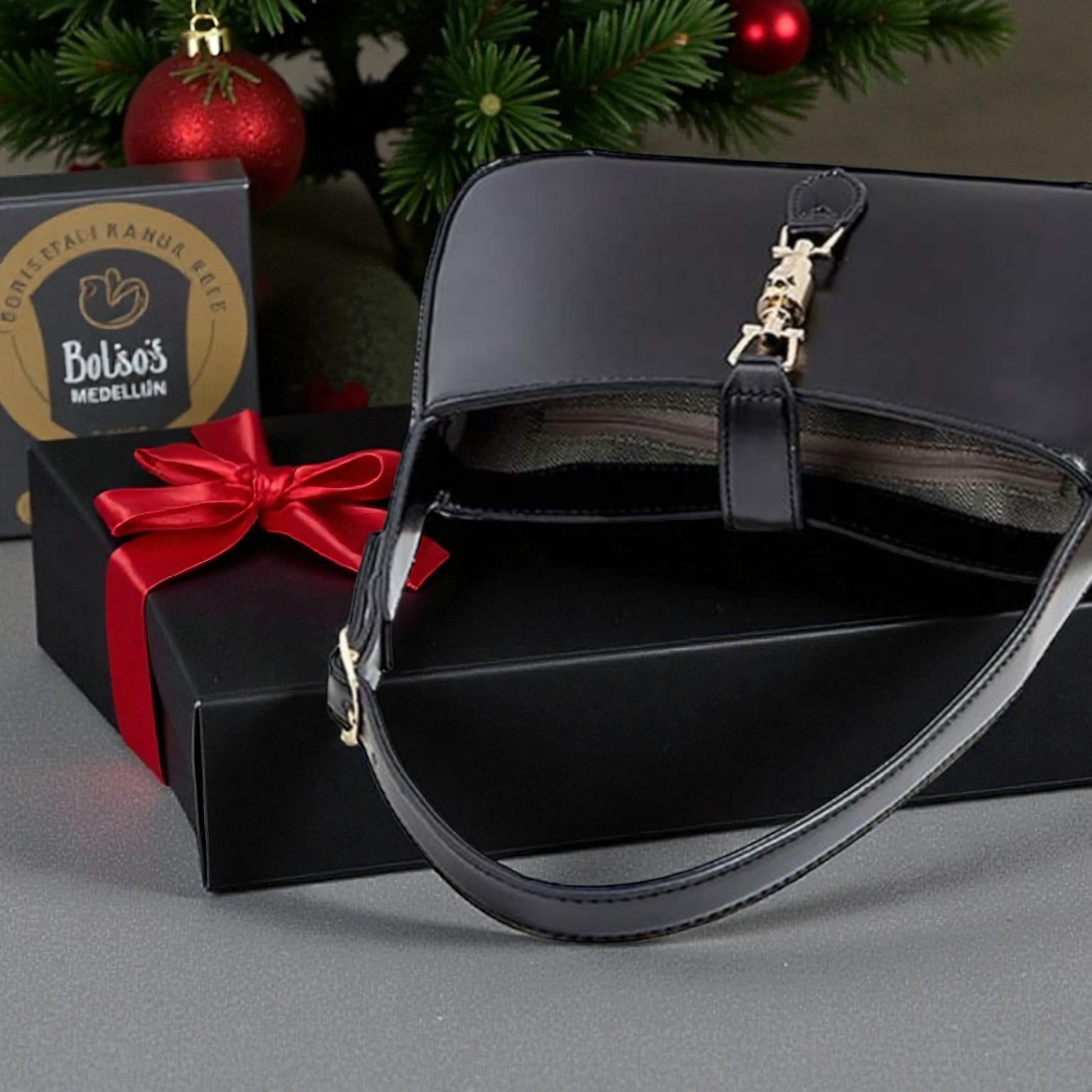 - Cierre frontal con detalle metálico dorado tipo gancho/clip (acentúa el look premium).